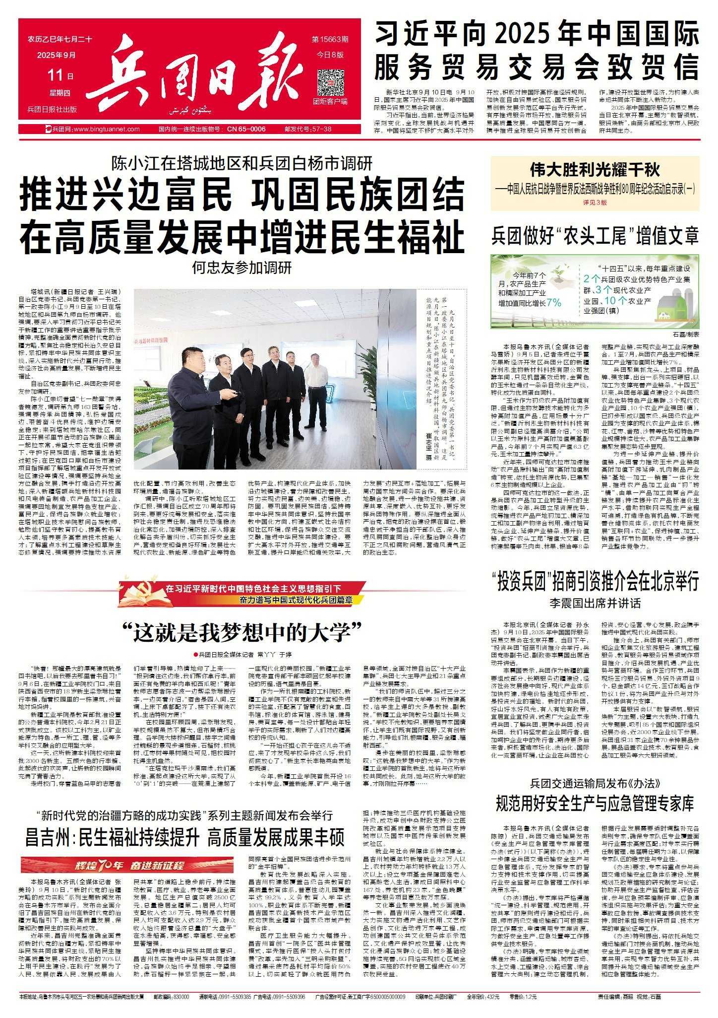 9月11日,兵团日报头版发表《“这就是我梦想中的大学”》,对beat365在线唯一官网2025年迎新工作及学校建设情况进行报道,全文如下: