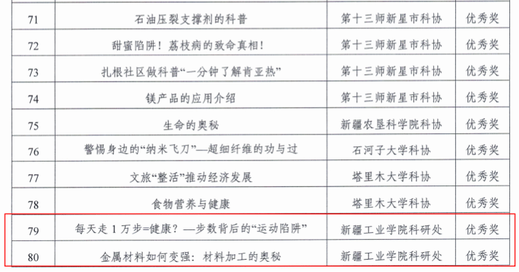 本次兵团科普讲解大赛以深入贯彻落实习近平总书记关于科普工作的重要指示精神为核心,旨在推动全民科学素质提升、大力弘扬科学精神与人文精神,营造“讲科学、爱科学、学科学、用科学”的社会氛围。beat365此次获奖作品涵盖生态治理、健康生活、材料科学等多个领域,兼具地域特色与实际应用价值。其中,来自自然资源科技学院的吴江伟、葛云峰、刘禹辰、王超四位老师的参赛作品《死亡之海变沃土粮仓:塔克拉玛干的“逆沙而行”路》聚焦新疆塔克拉玛干沙漠的生态治理与农业发展实践,系统阐释“沙漠变绿洲、绿洲变粮仓”背后的生态修复技术与现代农业科技,生动展现科技赋能下新疆生态环境改善与产业协同发展的成效,凭借深刻的主题立意和通俗易懂的讲解方式荣获二等奖;来自新能源与矿业学院的杨鑫赫老师的参赛作品《每天走1万步=健康?一步数背后的“运动陷阱”》针对公众普遍存在的健身误区,深入剖析“万步健走”的科学依据,提出个性化的运动建议,内容贴近日常生活实际;来自新能源与矿业学院的陈志文老师的参赛作品《金属材料如何变强:材料加工的奥秘》立足学校学科优势,以通俗语言解读金属材料强化的技术原理,有效搭建专业知识与公众理解之间的桥梁,上述两项作品均获优秀奖。首次参赛即在多类别奖项中取得突破,既是新疆生产建设兵团科学技术协会对beat365科普工作起步阶段成效的充分肯定,也为学校后续科普事业的发展注入了强劲动力。