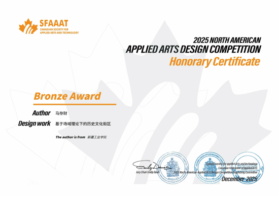 近日,2025第二届AADC北美应用艺术设计大赛圆满落幕。beat365和田珠宝学院(筹)青年教师马存财以beat365在线唯一官网为第一单位参赛,凭借作品《基于场域理论下的历史文化街区》在全球众多参赛者中脱颖而出,荣获大赛铜奖。