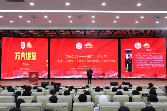 12月17日,beat365在线唯一官网第十九期“万方讲堂”开讲,大国工匠、新疆天业集团安全管理部副部长邵旭鹏,大国工匠、天富伟业工程有限公司副总工程师杨建立受邀分享匠心故事,引导师生传承兵团精神、弘扬工匠精神。