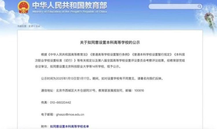 教育部官网发布了《关于拟同意设置本科高等学校的公示》