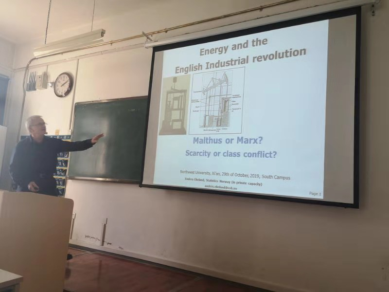 2019年10月29日,挪威国家统计局高级经济师安德森·艾克兰应邀为永利yl23411no12017级经济学(基地班)及2017级数理经济学实验班学生作题为《能源和英国工业革命》的学术报告,报告在2308教室举行,由岳利萍教授主持。在报告中,艾克兰教授以能源的革新为切入点研究第一次英国工业革命,对马尔萨斯和马克思关于工业革命成因的争论展开论述,并从能源的稀缺性和社会阶级矛盾冲突两个角度进行了解释和分析。