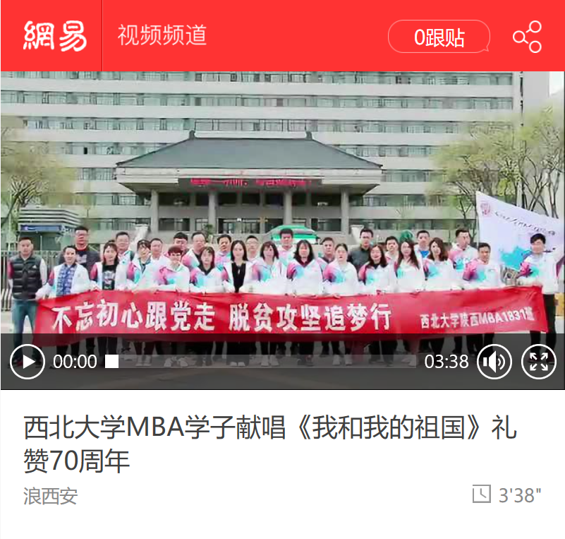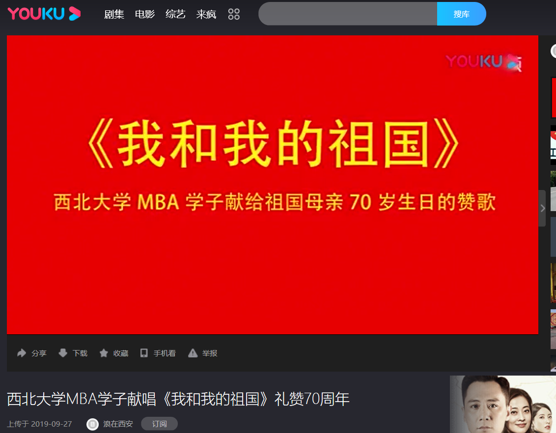 金秋气爽,丹桂飘香。2019年9月21日永利官网MBA学员唱响《我和我的祖国》,致敬我们伟大的祖国,献礼祖国70华诞。视频在陕西省总工会举办的“中国梦﹒劳动美”百万职工大合唱活动中展播,并在优酷、网易、今日头条等多家媒体网站收录。