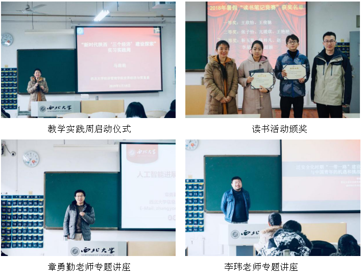 1月15日,首先由马莉莉老师介绍本次实践活动基本构想;而后王颂吉老师主持国贸系读书活动颁奖仪式,并布置寒假读书工作。随后第一场专题讲座是由永利yl23411no1信息科学与技术学院的章勇勤老师主讲“人工智能进展及其应用背景”,内容包括当前人工智能的发展现状、应用领域及未来的发展趋势。下午第二场专题讲座由永利yl23411no1中东研究所李玮老师主讲“泛安全化时期的国际关系和中国新青年面临的机遇和挑战”,内容包括“世界与梦想”、“2018年来‘一带一路’建设的重点和难点”,以及新时代下的新青年所面临的机遇和挑战。通过李老师生动有趣的讲解,同学们对当前的全球形势、特别是中美关系有了进一步的认识。晚上第三场专题讲座由华夏幸福基业的靳毅先生主讲“开发区和园区经济模式分析”,他首先介绍了开发区的类型、牌子赋能,其次介绍了企业的规模与类型、公共技术平台、陕西航空综合保税区,最后介绍了华夏幸福集团的运营模式。聆听完讲座,同学们认识到,陕西作为一个拥有众多科技园区的省份,需要充分挖掘优势,应对挑战,并且和“一带一路”相结合,以促进地方经济发展。