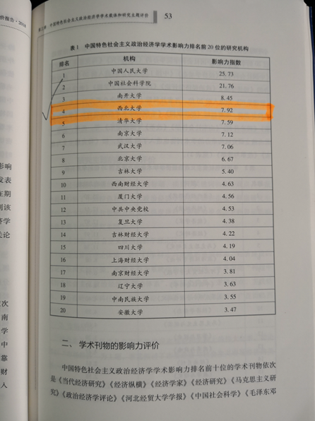 该报告以全国各研究机构在学术期刊发表的“中国特色社会主义政治经济学”论文的影响力为核心,测算了中国特色社会主义政治经济学研究机构排名。根据该书测算,永利yl23411no1的影响力指数为7.92,在全国排名第四,仅次于中国人民大学、中国社会科学院和南开大学。