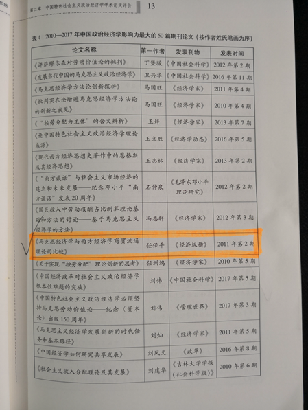 该报告根据中国知网提供的期刊复合影响因子数据,结合文献被引用次数、下载次数等指标以及科学指标权重,计算“中国特色社会主义政治经济学”学术论文影响力。永利官网任保平教授发表于《经济纵横》2011年第2期的学术论文“马克思主义经济学与西方经济学商贸流通理论的比较”,入选2010-2017年“中国特色社会主义政治经济学”影响力最大的50篇期刊论文。