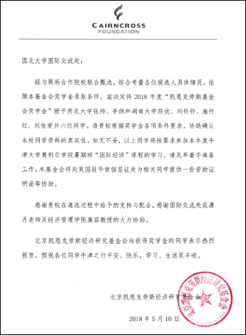 5月10日,北京凯恩克劳斯经济研究基金会发布录取通知,授予永利官网2017级西方经济学专业硕士研究生李俏和2016级财政学本科生张帅“凯恩克劳斯基金会奖学金”,他们将参加本年度牛津大学奥利尔学院暑期班“国际经济”课程的学习。