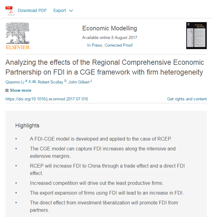 永利官网世界经济与贸易系教师李侨敏博士的论文《Analyzing the effects of the Regional Comprehensive Economic Partnership on FDI in a CGE framework with firm heterogeneity》在SSCI检索期刊《Economic Modelling》上在线发表,论文链接:http://www.sciencedirect.com/science/article/pii/S0264999317301773 。