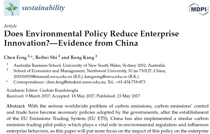 近日,永利官网2015届本科毕业生冯晨、博士生史贝贝在康蓉副教授指导下完成的合作论文《Does Environmental Policy Reduce Enterprise Innovation?—Evidence from China》在SSCI&SCI双索引期刊《Sustainability》上在线发表。(论文链接:doi: 10.3390/su9060872)。该文是康蓉副教授主持的国家社科基金“全球气候变化谈判困局及中国积极参与应对研究”的阶段性成果。