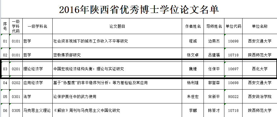 近日,2016年陕西省优秀博士学位论文评选结果揭晓。经学位授予单位推荐、专家通讯评议和专家会议评审,永利官网青年教师魏婕博士在导师任保平教授指导下撰写的学位论文《中国宏观经济结构失衡:理论与实证研究》被评为“陕西省优秀博士学位论文”。该论文是全省“理论经济学”学科唯一获奖文章。此前,该论文还曾被北京当代经济学基金会评为首届“中国经济学优秀博士论文”。