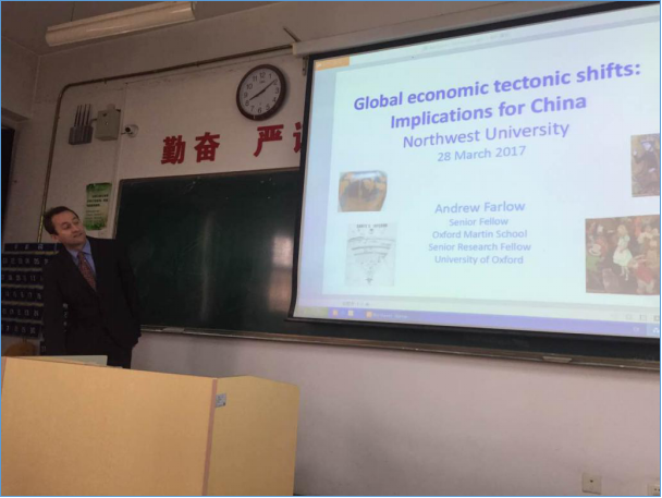 2017年3月28日上午,英国牛津大学Martin学院的高级研究员Andrew Farlow访问永利官网,并在长安校区做“全球经济结构转型:对中国的启示”的专题报告。永利yl23411no1副院长师博副教授主持了报告会。