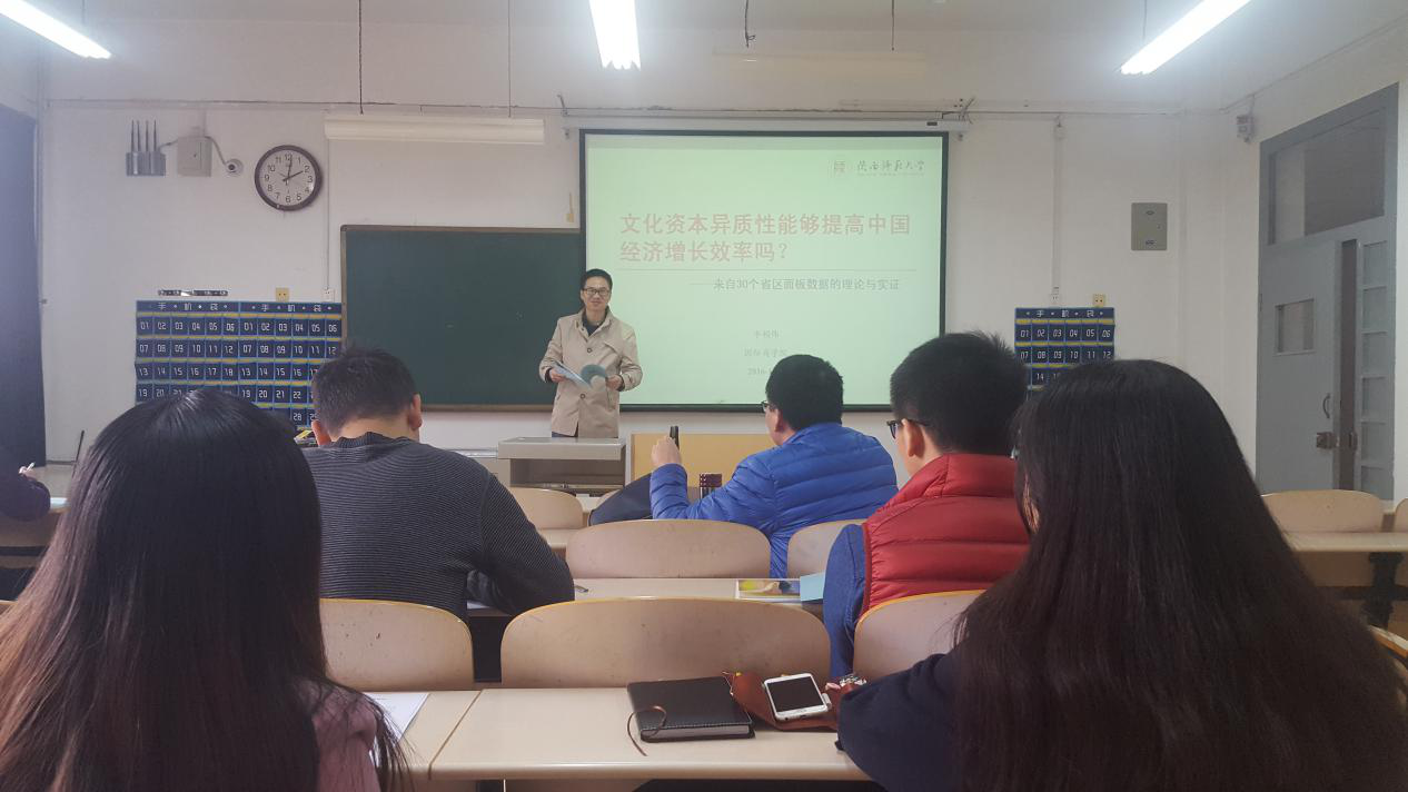 2016年11月9日下午,永利yl23411no1现代经济学理论与方法创新论坛第十二卷第六期在长安校区2号楼2310教室成功举行。陕西师范大学国际商学院的李娟伟老师对题为《文化资本异质性能够提高中国经济增长效率吗?——来自30个省区面板数据的理论与实证》的学术论文进行了汇报。报告由会计学系李辉老师主持,博硕士和本科生二十余人参加了本次讨论。