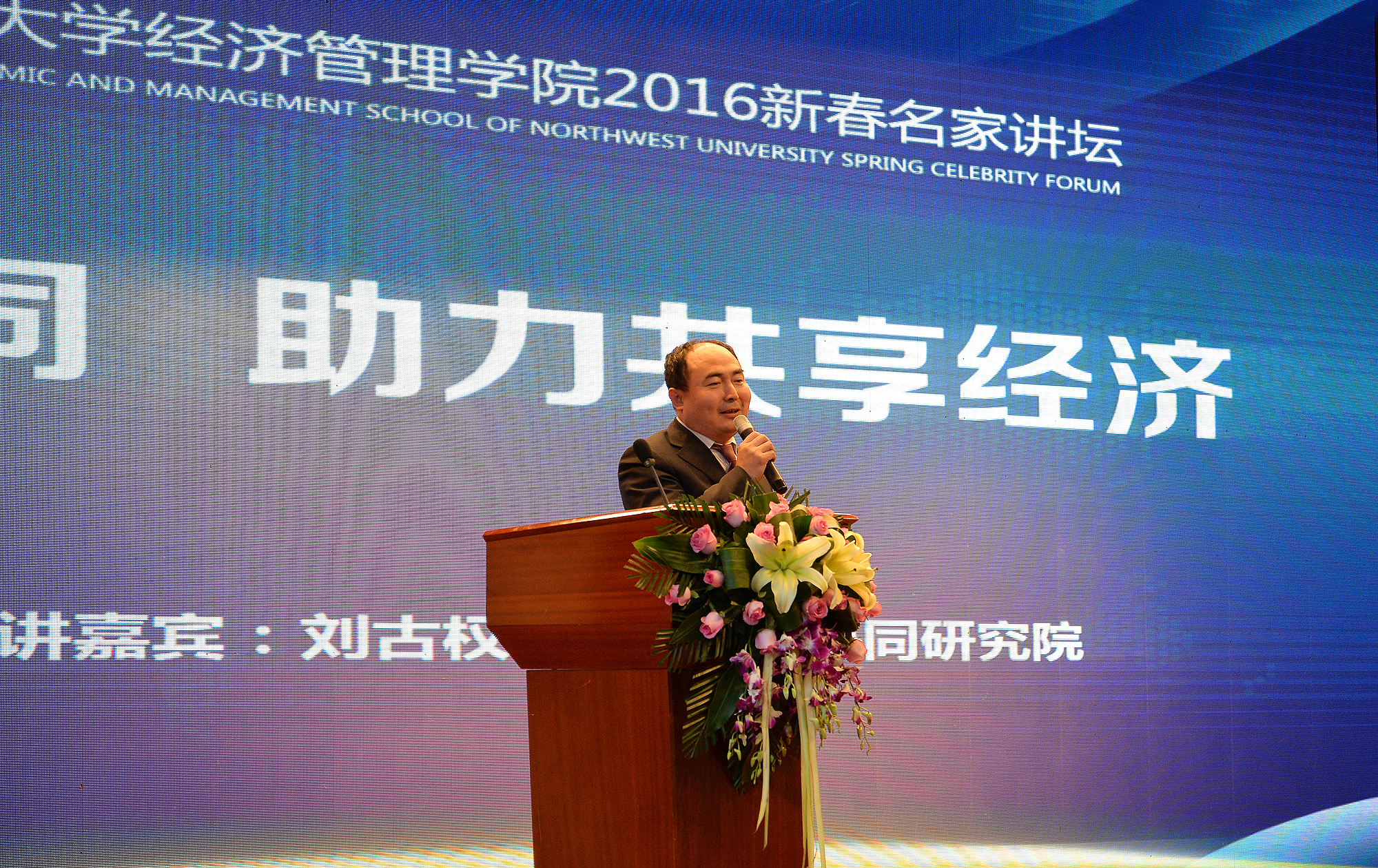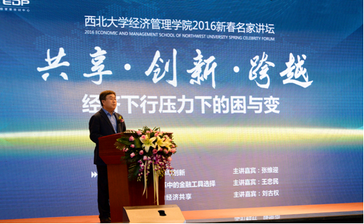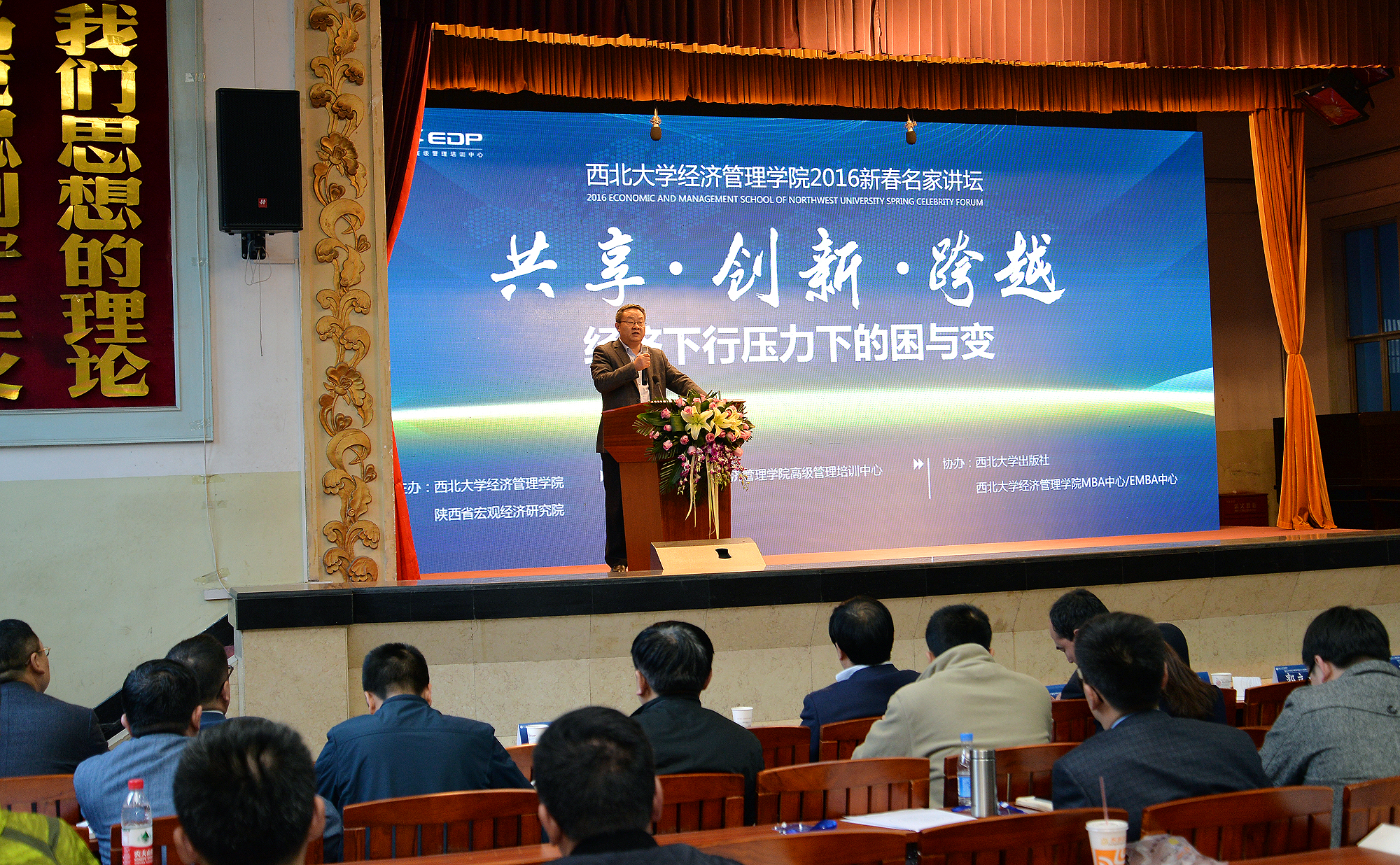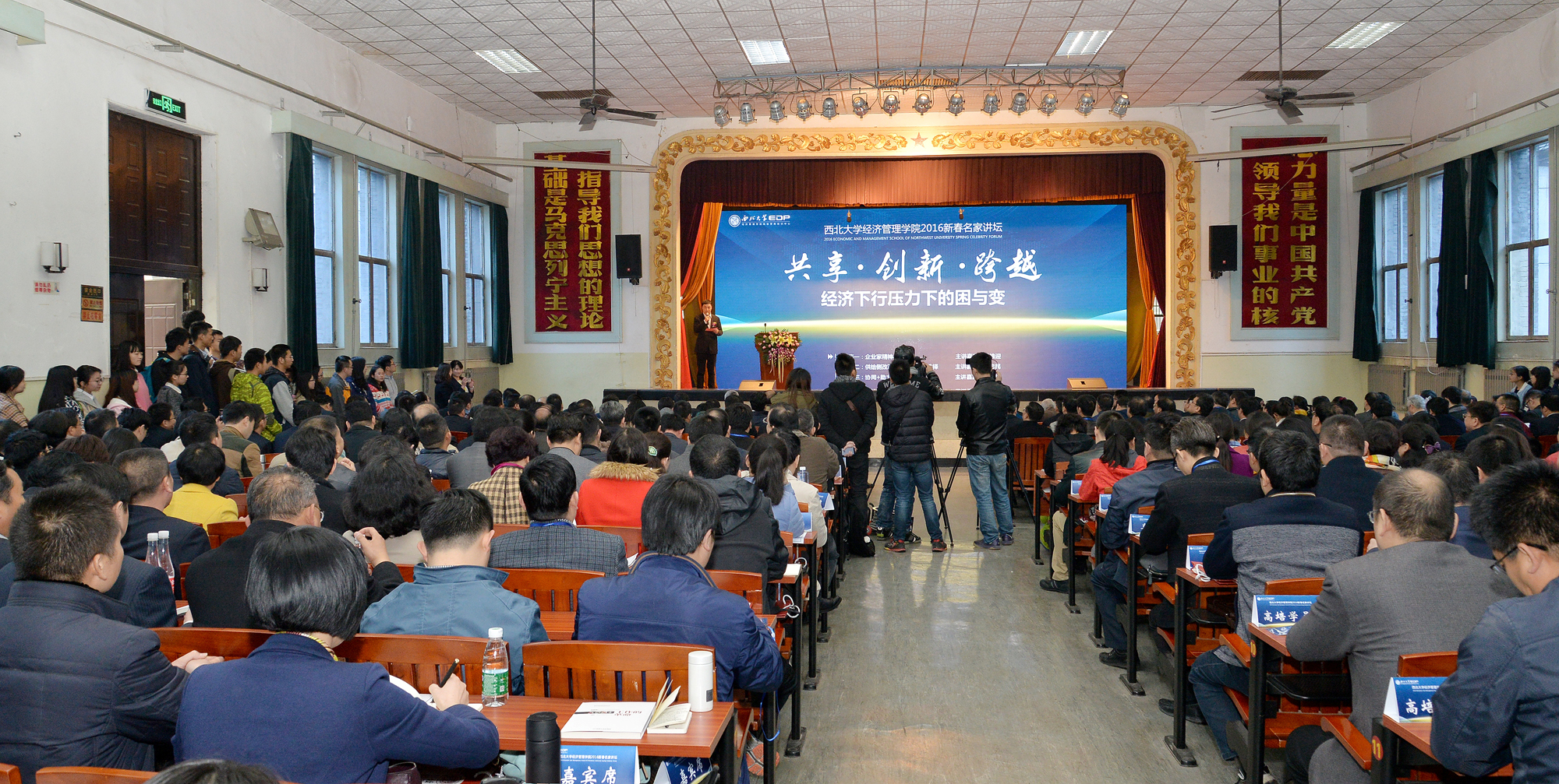 3月25日,由经管学院和陕西省宏观经济研究院举办、经管学院高级管理培训中心承办的“2016新春名家讲坛”在太白校区大礼堂成功举行。本次讲坛以“共享·创新·跨越——经济下行压力下的困与变”为主题,邀请杰出校友、著名经济学家张维迎,全国社保基金副理事长、永利官网前校长王忠民,致远软件营销副总裁、协同研究院院长刘古权和经管学院院长、陕西省宏观经济研究院执行院长任保平在讲坛上围绕“企业家精神”、“供给侧改革”和“协同共享发展”作了演讲。校长郭立宏在活动中讲话,党委副书记、副校长、博士生导师贾明德主持了讲坛。陕西省发改委副主任刘迎军和发改委相关部门负责人出席了讲坛,经管学院和校内其他院系600余人聆听了讲座。