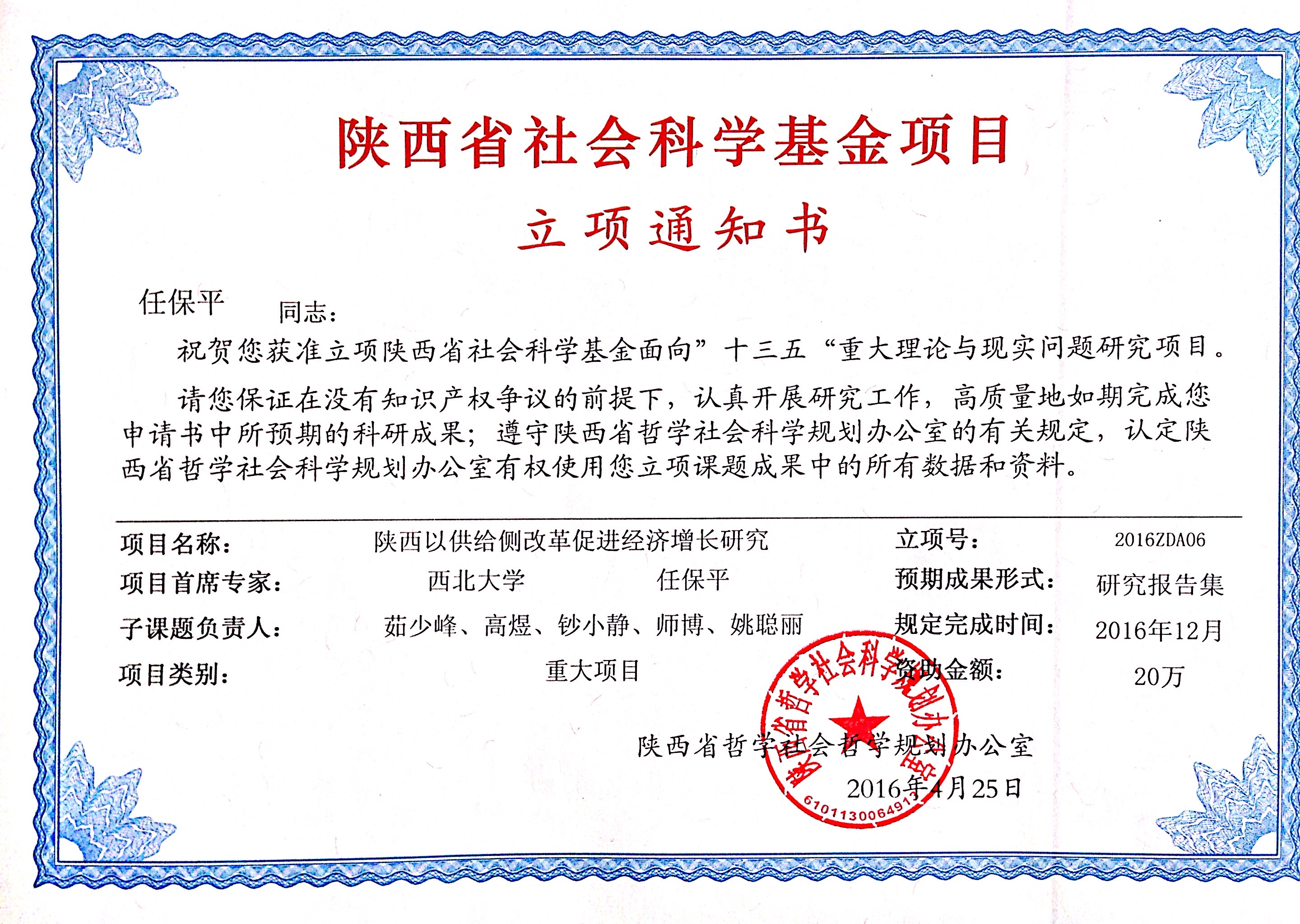经陕西省哲学社会科学规划领导小组批准,永利官网任保平教授主持的“陕西以供给侧改革促进经济增长研究”以及何爱平教授主持的“中国特色社会主义政治经济学的创新发展研究”立项为陕西省社会科学基金面向“十三五”重大理论与现实问题研究项目。