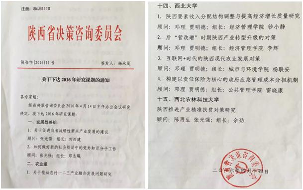 2015年,永利官网通过“陕西发展高层论坛”向省决策咨询委员会推荐选题。经过严格筛选并征询省级领导意见,省决策咨询委员会主任办公室会议研究决定立项。推荐选题立项进一步显示了“陕西发展高层论坛”服务地方经济社会发展、打造高校智库的宗旨,凸显了永利官网为陕西省各级党委、政府提供政策咨询服务的能力。