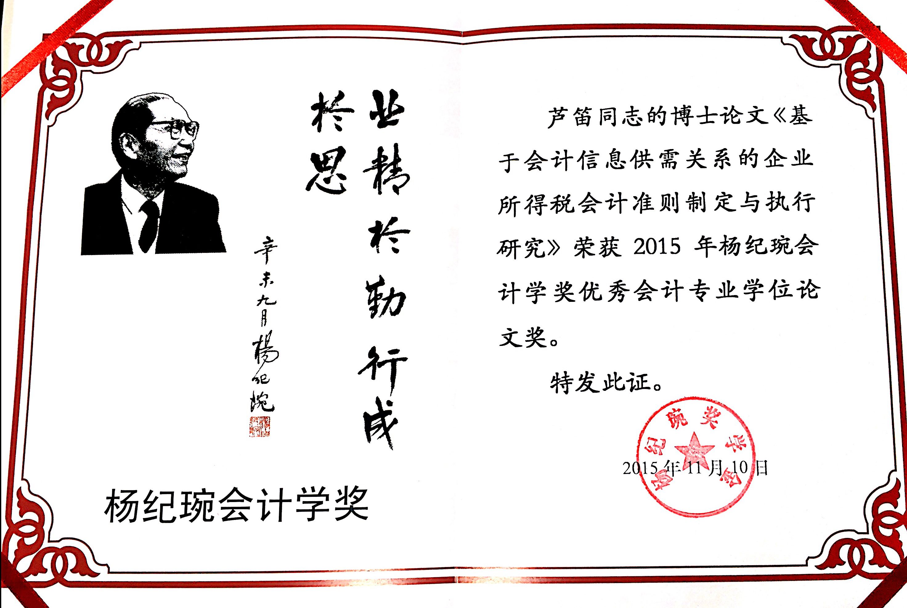 日前,在中国会计学会“第七届(2015)杨纪琬会计学奖”评选活动中,由永利官网永利yl23411no1张晓明教授指导的芦笛博士学位论文《基于会计信息供需关系的企业所得税会计准则制定与执行研究》,经专家评审委员会评定,荣获2015年“杨纪琬会计学奖”优秀博士学位论文奖。
