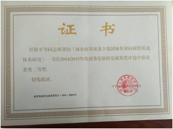 近日,商务部公布了2014/2015年全国商务发展研究成果奖获奖作品,在此次评奖中,在全国范围内征集作品,著作类共评出了一等奖2项、二等奖8项、三等奖13项。由任保平教授等著的《城乡统筹视角下我国城乡双向商贸流通体系研究》荣获二等奖。