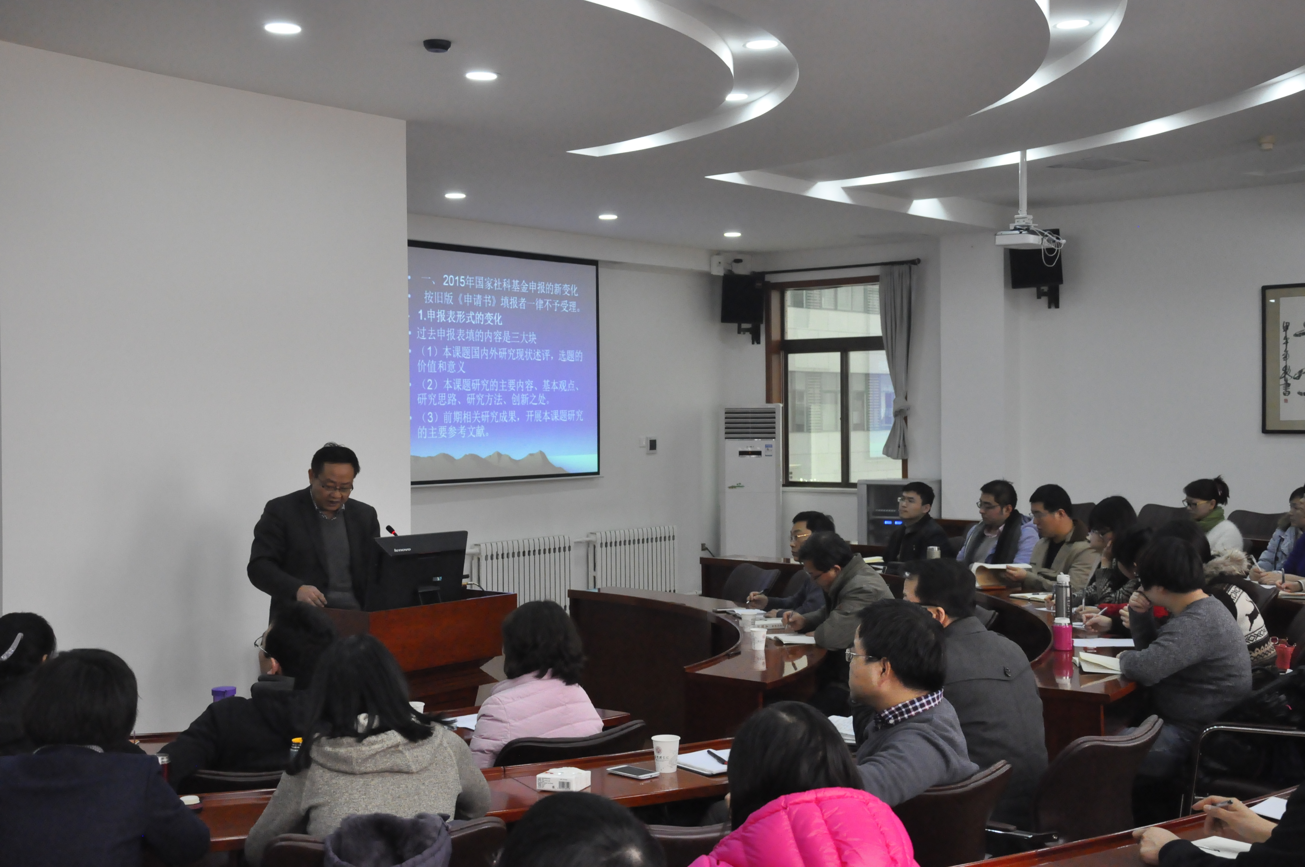 随后任保平教授做了《2015年国家社科基金申报的新变化及其注意事项》的报告。任保平教授首先从国家社科基金申报表形式、填写字数、填写中的新要求、活页填写格式和指南要求等5个方面分析了2015年国家社科基金的新变化。以此为基础,任保平教授进一步阐述了申报国家社科基金需要注意的事项。他指出:在选题方面,应关注国家大政方针尤其是十八大以及十八届三中全会精神。并且在确定选题时需要将自身的研究优势与《课题指南》完美结合,设计出有吸引力、能激发共鸣和具有可研性的选题;在项目选题申报依据中需要注意梳理国内外相关研究的学术史,凸显研究的学理价值和实践意义;在研究内容设计上切忌轻描淡写,同时要实现理论性、实践性和政策性相结合、强化逻辑性、体现学科理论工具以及研究亮点;在研究方法方面需要注意,方法论与具体研究方法相结合、突出主流和前沿的方法、突出研究方法的技巧性和技术性;在参考文献方面,重点把握经典文献、突出代表性、紧跟高层次刊物、追踪前沿性以及国内外文献相结合;同时也需注意,书写规范、行文习惯、字数规模、后期检查以及成果填报等诸多细节问题。最后,任保平教授鼓励大家在申报过程中应该摆放好个人心态,申报国家社科基金不是一朝一夕的事情,而是多年积累的结晶,面对“九死一生”的申报成功率,不论成与败,都要积极坦然地从容面对。