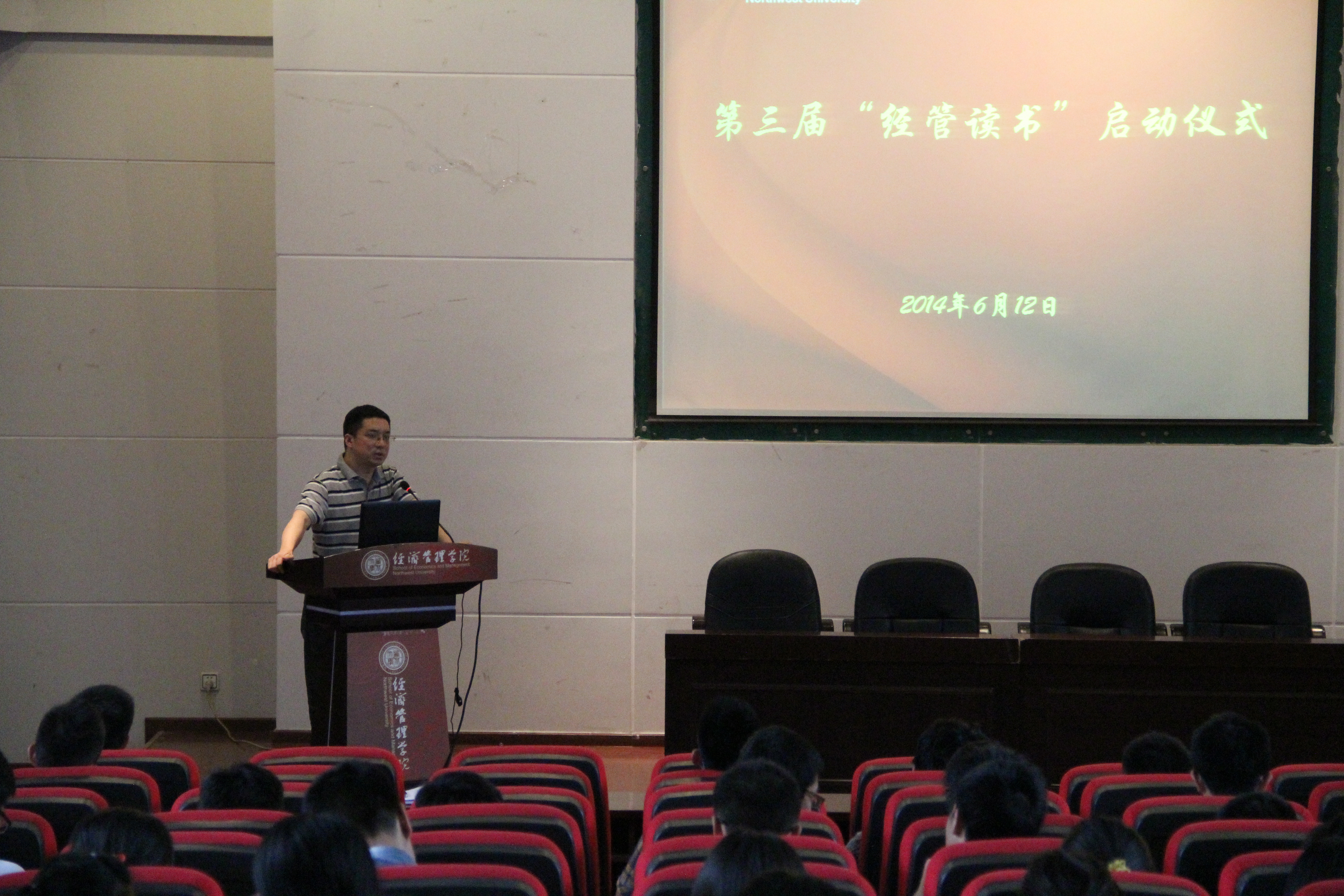 仪式上,院党委副书记李一凡首先宣讲了本次“经管读书”活动方案细则,并解读了本次活动同过往两届活动的不同点,一是本次读书活动引入了教师参与,学院各个系都推荐了教师担任本次活动的读书导师,指导本科生读懂、读透经典。并组织学生开展各类读书交流活动。二是扩充了读书数目,公布了100本经济类书籍,100本管理类书籍和50本人文类书籍。阅读采取读书小组模式以提高读书效果,三是对读书成果有明确要求,对不同年级提出了难度不同的要求,并要求活动要有延续性。之后本科生代表孙飞扬同学,研究生代表博丹同学分别发言,分享了自己的读书感悟。最后,院党委书记李国良讲话,李书记为大家列举了多个国家人均阅读量,并引用温总理曾经讲到关于读书关系到一个人的思想境界和修养、一个民族的素质、一个国家的兴旺发达的事例,给予了同学们很好的启发。李书记希望同学们要“爱读书、勤读书、会读书”,挑选真正有益的书籍,掌握正确的阅读方法,使开卷更加有益。至此,第三届“经管读书”活动正式启动。