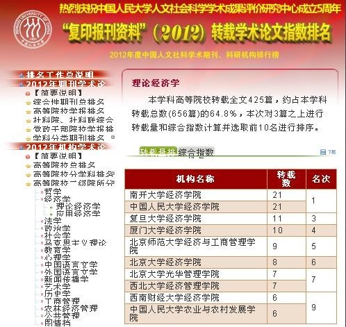 3月26日,2012年度“人大复印报刊资料”转载学术论文指数排名及相关分析报告正式发布。永利官网在高等院校二级院所“理论经济学”学科转载排名中取得了转载量第7名、综合指数第8名的好成绩。转载量和综合指数排名比2011年度各上升2位。这一排名充分说明永利官网在理论经济学研究方面具有明显优势,在近年来更是取得了长足的进步。