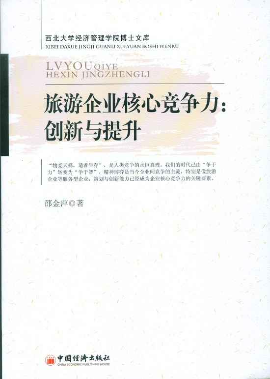 近日,永利官网旅游管理系教师邵金萍博士的著作《旅游企业核心竞争力:创新与提升》由中国经济出版社出版发行,为永利官网资助出版的16本“永利yl23411no1博士文库”系列丛书之一。该书在其博士论文的理论框架下,概括了作者近年来在旅游企业核心竞争力问题上的最新研究成果,是继她与杨永平副教授的合著《旅游企业核心竞争力》出版后的又一新著。