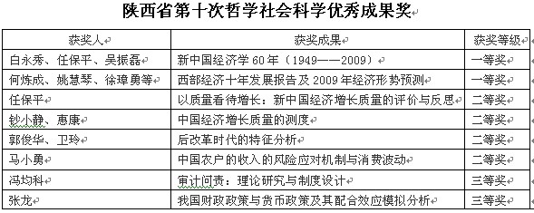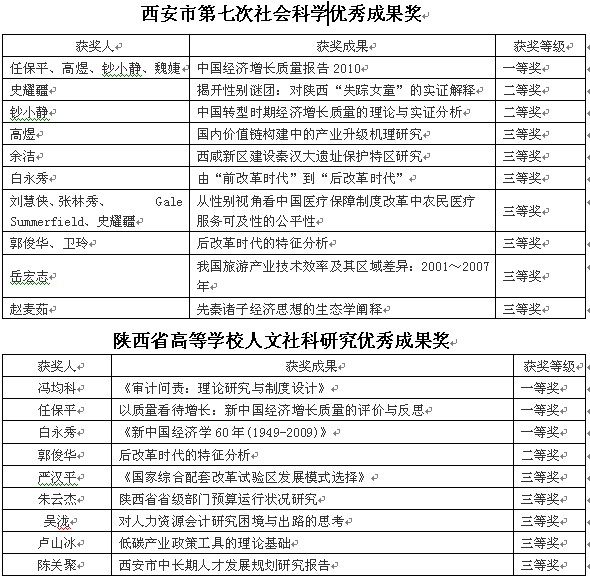 经过努力,永利官网2011年科研工作成绩喜人。一是科研获奖数量有所增加,获奖层次不断提高。经统计,全院一年共获各类科研奖励35项,其中省部级19项、厅局级9项、其他7项。有代表性的获奖是:何炼成、姚惠琴等《西部经济十年发展报告及2009年经济形势预测》、白永秀、任保平的《新中国经济学60年(1949-2009)》获陕西省第十次哲学社会科学优秀成果一等奖;任保平等的《中国经济增长质量报告2010》获西安市第七次社科优秀成果一等奖;任保平的《以质量看待增长:新中国经济增长质量的评价与反思》、郭俊华的《后改革时代的特征分析》、钞小静的《中国经济增长质量的测度》陕西省第十次哲学社会科学优秀成果奖二等奖;白永秀、任保平等的《以西安为中心的关中城市群研究》获陕西省科学技术奖二等奖。