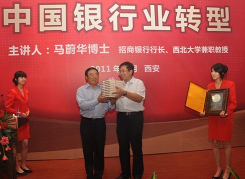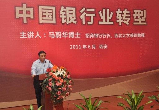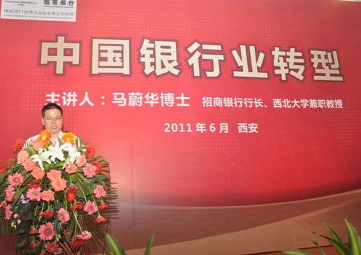 马蔚华在题为《中国银行业转型》的演讲中分三个部分对中国银行业的发展进行了回顾和展望。其一,回顾了改革开放30多年来中国银行业取得的成绩,堪称“奇迹”,而伴随着中国经济整体实力的提升,银行业的传统生存模式受到了严峻的挑战,需要探索新的银行业发展道路;其二,从整个经济的外部环境、银行业的监管约束条件和银行业服务对象需求的极大转变三个方面谈到中国银行业转型的必要性,指出30多年来中国银行业发展所依赖的优势已经基本不存在了,转型迫在眉睫;其三,以招商银行为例,具体的谈到了中国银行业转型的路径,指出观念要继续开放,同时一定要打造自身的核心竞争力,建立良好的企业文化,保持发展的可持续性。演讲结束后,他还和在座师生开展了热烈而深入的互动交流。