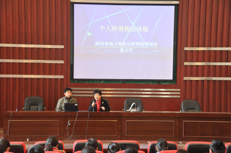 2010年12月15日下午2点,陕西省地税局所得税管理处董天学处长应邀在金海报告厅为永利官网学生做了题为《个人所得税基本原理》的专题报告。报告会由永利官网会计专业系主任张晓明教授主持,150余名会计系学生参加。