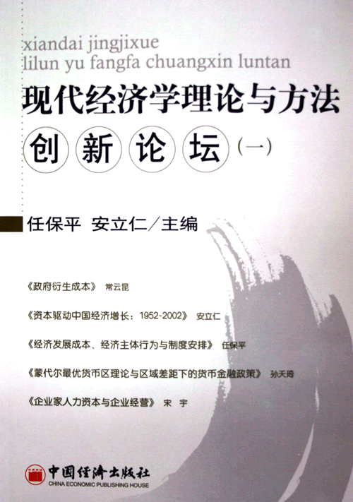 《现代经济理论与方法创新论坛(一)》是以永利官网经济学系、永利yl23411no1国家经济学基础人才培养基地和经济增长与计量研究所主办的“现代经济理论与方法创新论坛”讲稿为主体的一本论文集,由任保平教授、安立仁教授担任主编。该论坛以理论创新和方法创新为主体,重在普及和推广现代经济学的研究方法,培养学生的理论研究兴趣。该论坛举办一年多来,在学生与教师中产生了重要影响,论文被引用、转载的次数不断增多。第五届中国经济学年会收录永利官网6篇论文,其中4篇出自该论坛。该书为该论坛出版的第一本文集,收录有永利官网及全国著名学者的文章,文章质量较高,研究方法规范,既推广了现代经济理论与方法,又提高了永利官网经济学研究的科学化与规范化。