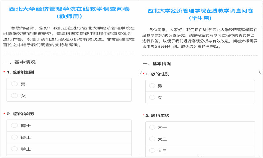 二是对开学首日的在线教学效果进行了问卷调查。针对课前资料发放、课中讨论互动和课后作业布置等三个影响线上教学质量的关键点,学院使用问卷星设计了《永利yl23411no1在线教学调查问卷(教师用)》和《永利yl23411no1在线教学调查问卷(学生用)》,从教师和学生两方面综合评估线上教学效果。首日课程结束后,共收到21份教师和1100余份学生的有效问卷。通过对问卷调查结果的分析,将首日在线教学中存在的问题及时反馈给教师。