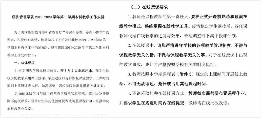 学院今年春季学期计划为在校本科生开设208门课程(其中辅修专业课程10门)。在全体本科任课教师的共同努力下,除了因疫情影响暂缓进行的实践课程外,所有理论课程全部启动线上教学。学院线上组织各系教师召开了疫情期间本科教学会议,详细讨论了本科教学调整方案,重点就教师在线教学培训、技术支持、课程在线答疑平台组建等方面进行了讨论和分工落实。组织教师参加学校线上教学培训,组建线上教学团队开展集体备课,要求教师在正式开课前熟悉和预演在线教学模式,熟练掌握在线教学工具。