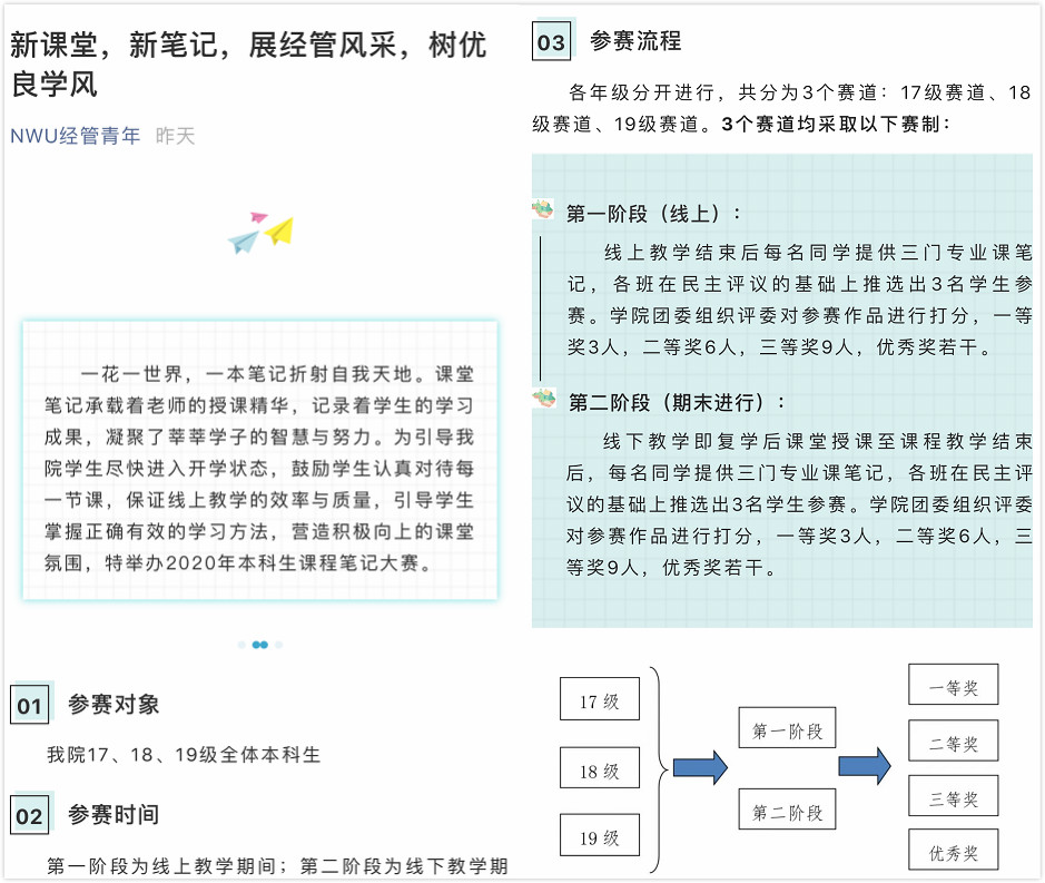 四是举办2020年本科生课堂笔记大赛。为引导永利官网学生尽快进入开学状态,鼓励学生认真对待每一节课,保证线上教学的效率与质量,引导学生掌握正确有效的学习方法,营造积极向上的课堂氛围,特举办2020年本科生课堂笔记大赛。