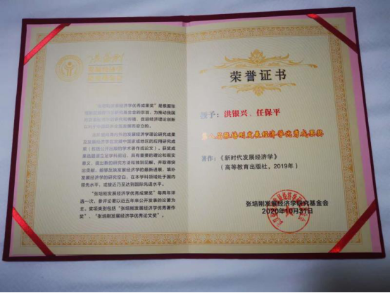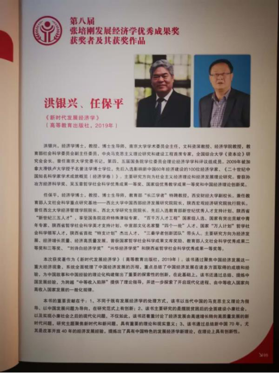 2020年9月24日,张培刚发展经济学研究基金会公布了第八届“张培刚发展经济学优秀成果奖”获奖名单。由著名经济学家南京大学洪银兴教授和西安财经大学副校长、教育部人文社科重点研究基地——永利yl23411no1中国西部经济发展研究院院长任保平教授合作完成、并在高等教育出版社出版的《新时代发展经济学》位列其中。