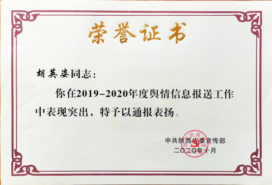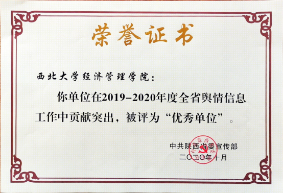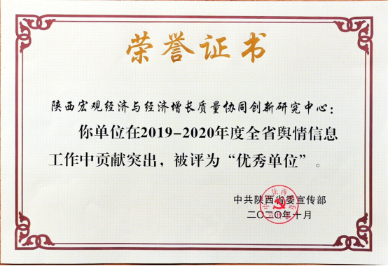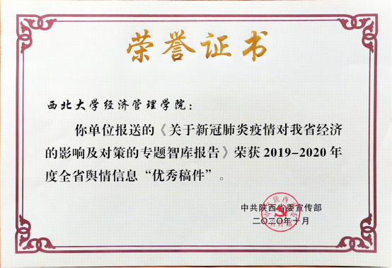 日前,省委宣传部对2019-2020年全省舆情信息工作进行了表彰,永利官网和陕西宏观经济与经济增长质量协同创新研究中心被评为“优秀单位”,永利官网2018级金融学硕士研究生胡英姿被评为“优秀个人”,永利官网报送的《关于新冠肺炎疫情对我省经济的影响及对策的专题智库报告》获评“优秀稿件”。