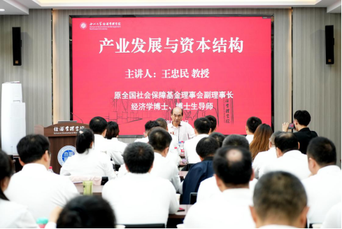 9月29日下午,永利yl23411no1原校长、全国社会保障基金理事会原副理事长王忠民教授应邀做客永利yl23411no1MBA教育和高级管理培训中心,为西安宏府集团卓越经理人研修班做了题为“产业发展与资本结构”的学术报告。报告会由校党委常委、副校长、永利yl23411no1院长吴振磊教授主持,西安宏府集团副董事长贾旭芝、总裁杨振、卓越经理人研修班学员60余人聆听了报告。