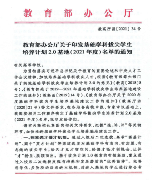 培养基础学科拔尖人才是高等教育强国建设的重大战略任务。2018年9月,教育部等六部门发布《关于实施基础学科拔尖学生培养计划2.0的意见》,旨在建设一批国家青年英才培养基地,选拔培养一批勇攀科学高峰、推动科学文化发展的未来杰出自然科学家、社会科学家和医学科学家,为把我国建设成为世界主要科学中心和思想高地奠定人才基础。按照教育部统筹安排,计划于2019-2021年分三批遴选建立260个涉及理科、文科及医科等不同领域的基础学科拔尖学生培养基地。