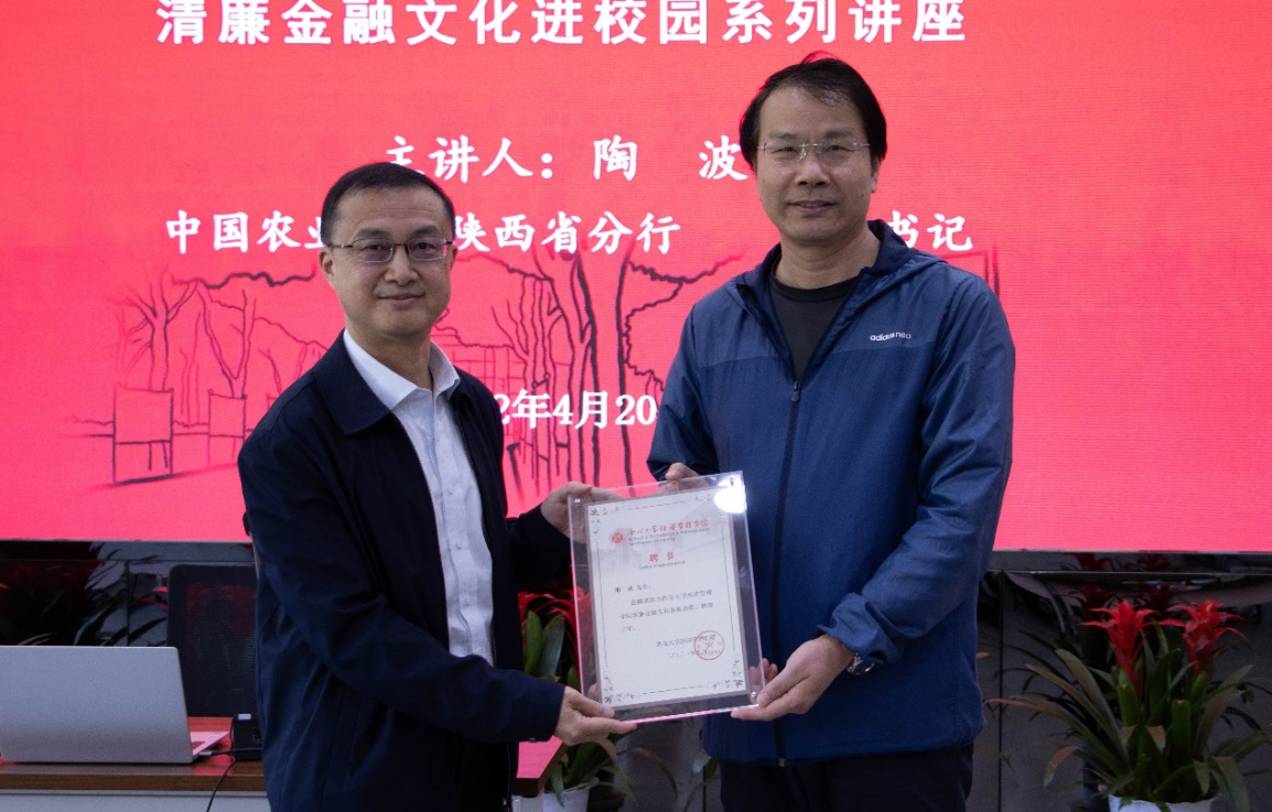 按照永利yl23411no1与陕西银保监局开展清廉金融文化共建活动的安排,4月20日,中国农业银行陕西省分行纪委书记陶波应邀到校,为永利yl23411no1师生做了本学期清廉金融文化系列讲座的第二讲,题为《金融领域反腐形势与实践》。永利yl23411no1纪委副书记王康,陕西银保监局纪委办张津崇,永利yl23411no1党委书记杜勇和学院40余名师生出席了本次活动。王康致辞,并为陶波颁发清廉金融文化客座讲师聘书,讲座由杜勇主持。
