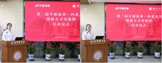 随后,实验班优秀学员代表陈茜、王小雨分享了在实验班半年多时光里的学习、收获和体会。感谢开源证券、永利yl23411no1提供了实验班这样创新、前沿、开放、包容的学习平台,加入实验班既学习了专业知识,又历练了实操技能,还积累了调研实践经验。感谢实验班使学员站在更高的平台上,看到更宽广的世界,开阔了视野,有勇气、有信心去拥抱新的变化、迎接新的挑战。