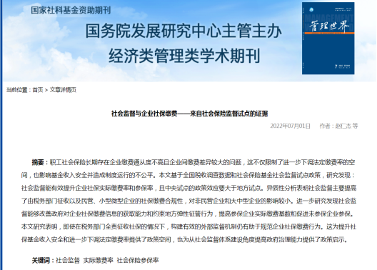 近日,永利官网经济系青年教师赵仁杰副教授第一作者的论文《社会监督与企业社保缴费:来自社会保险监督试点的证据》在国内顶级期刊《管理世界》2022年第7期发表。
