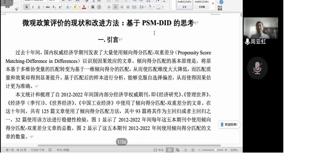 首先,周教授向大家介绍了倾向得分匹配—双重差分的基本原理,基于2012年—2022年国内外部分经济学权威期刊论文,即《经济研究》、《管理世界》、《经济学(季刊)》、《世界经济》和《中国工业经济》中使用了倾向得分匹配—双重差分的125篇文章,通过文献梳理,发现该方法的广泛应用和既有研究不足,具体为:第一,倾向得分匹配在经济学各个领域的应用都较为广泛,特别是在政策评估时成为一种重要的数据预处理手段。第二,倾向得分匹配方法常与双重差分法结合使用,10年间,进行反事实估计的文章占到发文量的65.6%。第三,倾向得分匹配作为一种数据预处理方法,能让处理组和对照组的可观测特征尽可能接近,但是需要满足平衡性假定和共同支撑假设两个前提,现有文章检验方法基本都是基于比较实验组和对照组样本均值是否存在统计意义上的差距,这种方法存在一定的不足之处。