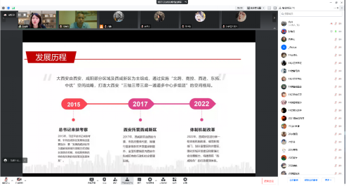 报告伊始,高鹏教授对孙梅艳书记的到来表示欢迎和感谢。随后,孙梅艳书记紧扣当前西咸新区沣东新城的形势和发展模式,介绍了西咸新区的概况和国家关于西咸新区的规划部署,详细解读西咸新区的重要战略和历史经纬。孙艳梅书记指出,西咸新区是经国务院批复设立的首个以创新城市发展方式为主题的国家级新区,位于西安、咸阳两市建成区之间,地理位置优势显著,发展潜力十足。政府秉持“一心双轴、一河五组团”的总体规划,大力打造“6+1”主导产业体系,发挥西咸新区作为国家创新城市发展方式试验区的综合功能,形成具有陕西特色和优势的创新驱动发展体系。