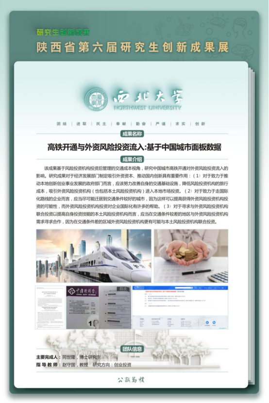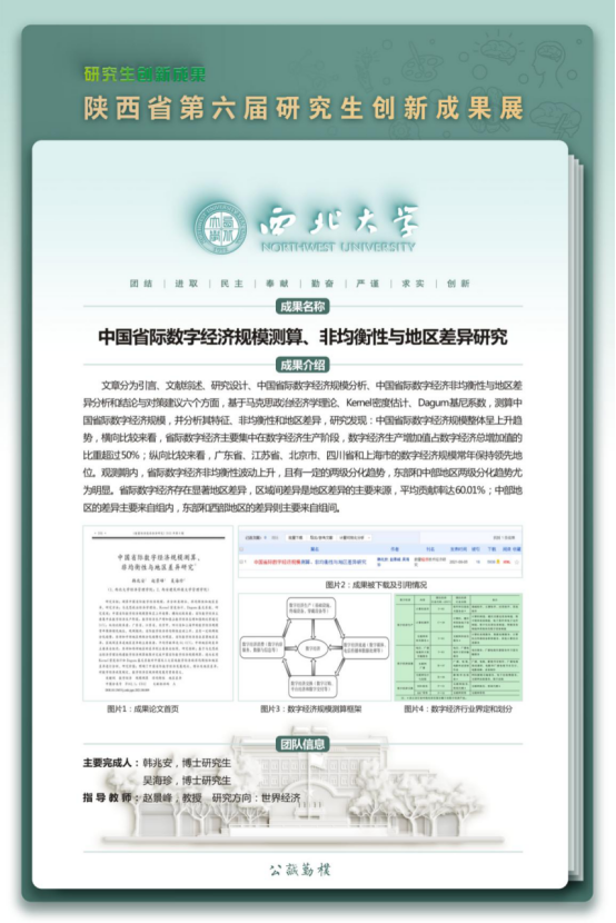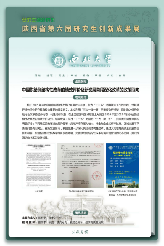 本届研究生创新成果展永利官网获奖作品形式以论文成果为主,其中理论经济学2项,应用经济学1项,彰显了近年来学院研究生拔尖创新人才培养的质量和水平。赵景峰教授指导的2019级博士研究生韩兆安的论文《中国省际数字经济规模测算、非均衡性与地区差异研究》荣获“文科组”一等奖;赵守国教授指导的2018级博士研究生同世隆的论文《高铁开通与外资风险投资流入:基于中国城市面板数据》、任保平教授指导的2020级硕士研究生苗新宇的论文《中国供给侧结构性改革的绩效评价及新发展阶段深化改革的政策取向》分别荣获“文科组”二等奖。此次活动充分展示了永利官网研究生的学术创新能力与研究能力,进一步彰显了永利官网的办学水平和人才培养质量。