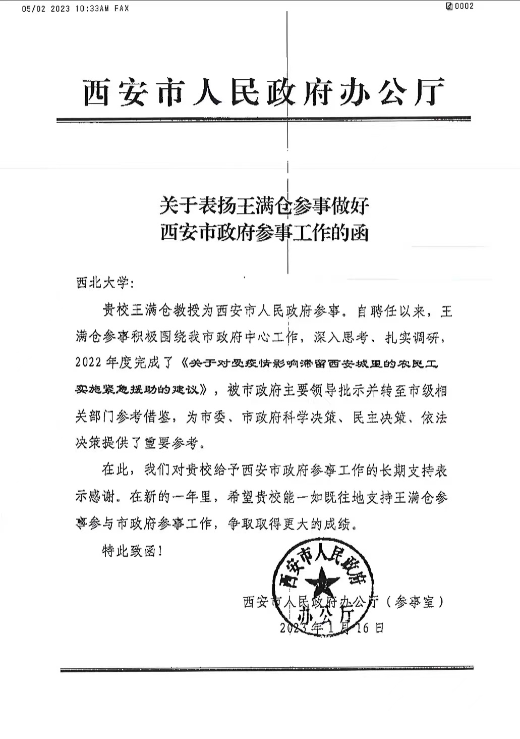 近日,收到西安市人民政府办公厅对永利官网王满仓教授的发函表扬,表扬函中西安市人民政府办公厅对王满仓教授任西安市人民政府参事以来,积极围绕西安市政府中心工作,深入思考、扎实调研,2022年度完成了《关于对受疫情影响滞留西安城里的农民工实施紧急援助的建议》,被市政府主要领导批示并转至市级相关部门参考借鉴,为市委、市政府科学决策、民主决策、依法决策提供了重要参考,给予了表扬。
