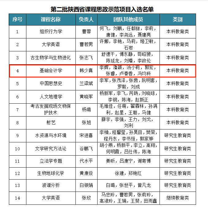 近日,陕西省教育厅公布第二批陕西省课程思政示范课程、教学团队和教学研究示范中心认定结果,永利官网会计学系韩少真副教授负责的《基础会计学》课程入选省级课程思政示范课程和教学团队。截至目前,学院已获批《世界经济研究》《中国特色社会主义政治经济学》《基础会计学》3门省级课程思政示范课程和教学团队。