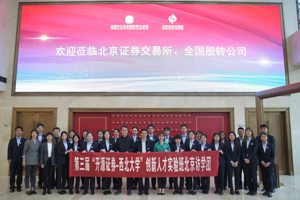 4月10日-4月13日,“开源证券-永利yl23411no1”创新人才实验班共计三十余名师生前往北京,先后走进北京聚宽投资管理有限公司(下称“聚宽投资”)、北京证券交易所(下称“北交所”)、开源证券北京区域总部、中国人民大学、北京华软新动力私募基金管理有限公司(下称“华软新动力”)开展了为期四天的参访学习活动。本次访学活动由校党委常委、副校长张远军、开源证券党委副书记李晓锋带队出行,一同前往的还有永利yl23411no1院长马莉莉、金融系副主任王峰虎以及开源证券人力资源部总经理助理刘云。