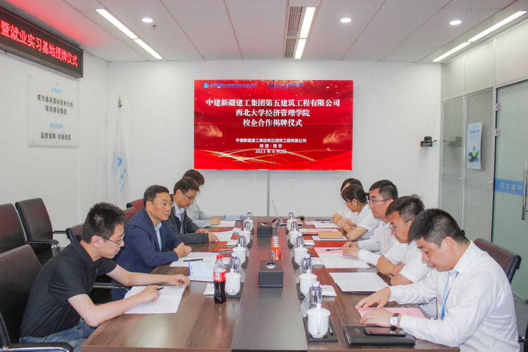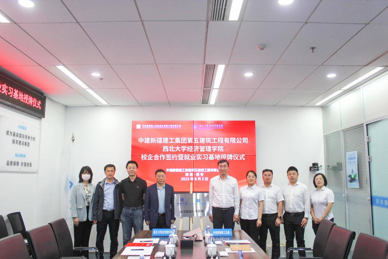 6月2日上午,永利官网党委书记杜勇一行前往中建新疆建工集团第五建筑工程有限公司进行校企合作签约暨就业实习基地授牌座谈会。中建新疆建工集团第五建筑工程有限公司党委书记、董事长薛孟斌,党委副书记、工会主席赵芸,副总经理、总工程师张宇飞,人力资源部经理陈坤,陕西分公司副经理赖达军参加座谈会。
