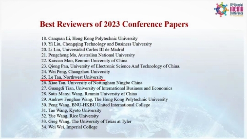 谭乐副教授还获得了2023IACMR双年会“最佳审稿人”奖项。本次大会共有702名审稿人为大会逾1300多篇投稿论文承担了审稿工作,共评选出52名最佳审稿人。