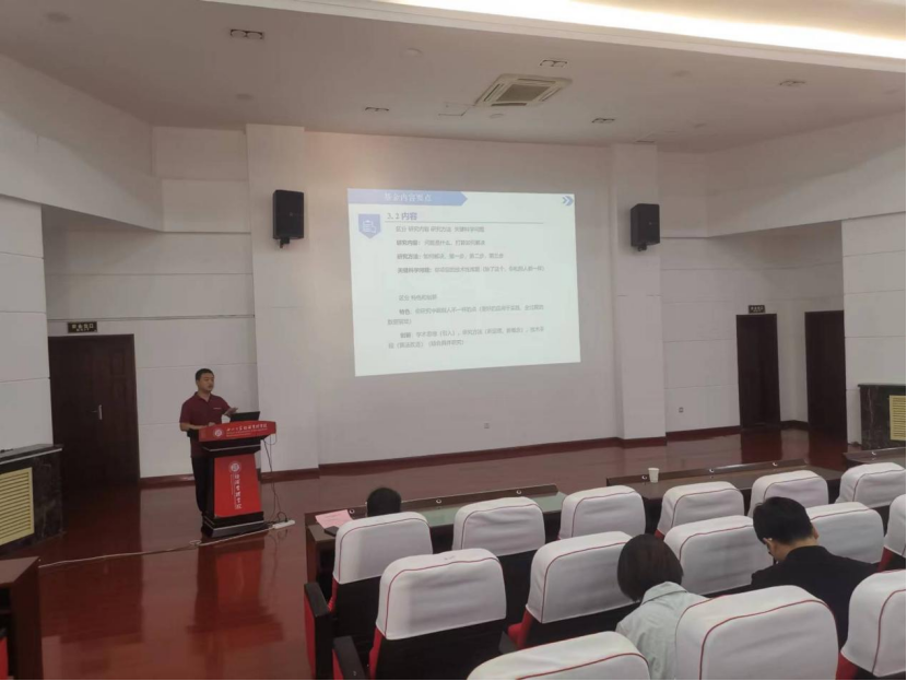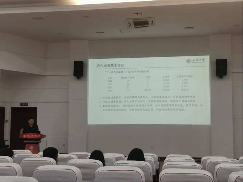 接下来,学院科研助理赵仁杰副教授对学院2020-2023年各类国家基金项目申报的数据进行了分析和对比说明,指出学院当前国家级课题申报面临的机遇和挑战,并提出了接下来的具体优化措施。