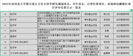 近日,教育部社科司公示了2023年度教育部人文社会科学研究规划基金、青年基金、自筹经费项目、西部和边疆地区项目评审结果,永利官网教师共获批8项,其中规划基金2项,青年基金4项,西部和边疆地区项目2项,立项数创近年来新高,学院特向各位获准立项的老师表示祝贺!