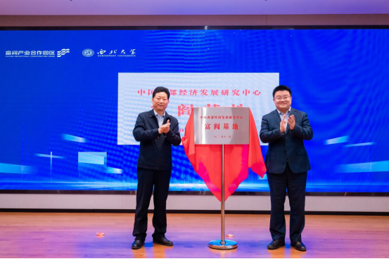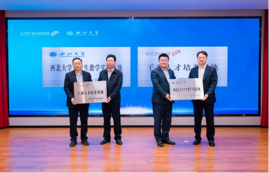 吴振磊副校长向李博副主任授牌“永利yl23411no1大学生教学实践基地”,杜银虎主任向杜勇书记授牌“富阎产业合作园区干部人才培养基地”,杜银虎主任与吴振磊副校长共同为“中国西部经济发展研究中心富阎基地”揭牌。